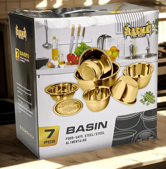 Série de Bols Doré 7 Pièces – Élégance et Polyvalence La série de bols dorés comprend 7 pièces pratiques : une râpe à carottes, une passoire, et 5 bols de tailles variées : 20 cm, 22 cm, 24 cm,